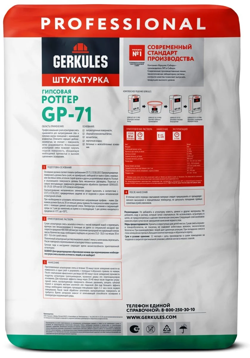 ГЕРКУЛЕС Штукатурка гипсовая РОТГЕР PRO GP-71 (30 кг) (45 шт)
