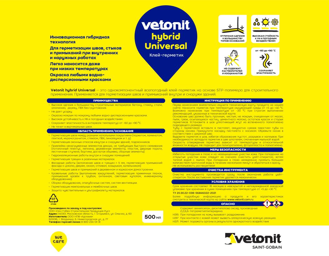 Герметик ветонит гибрид универсальный белый 500мл